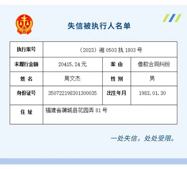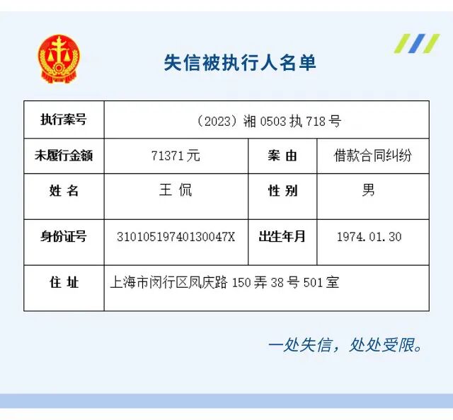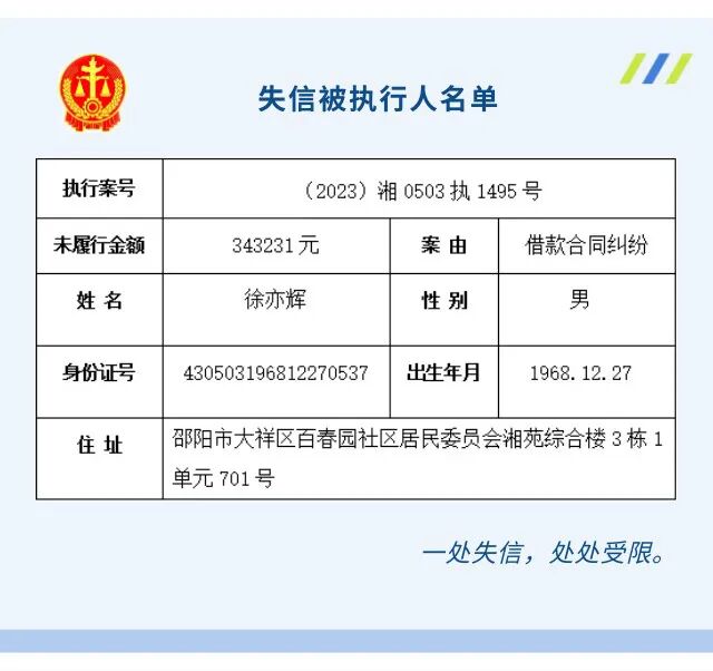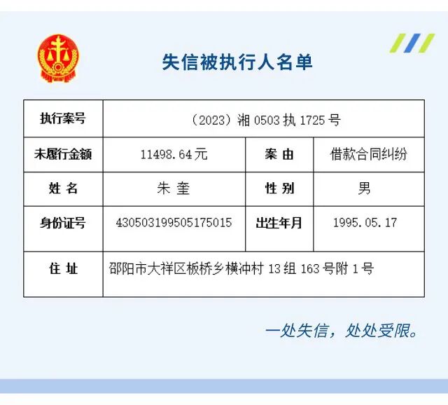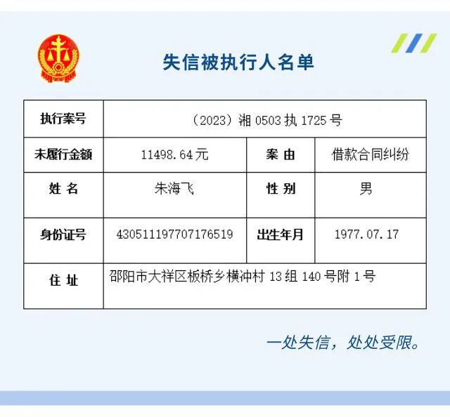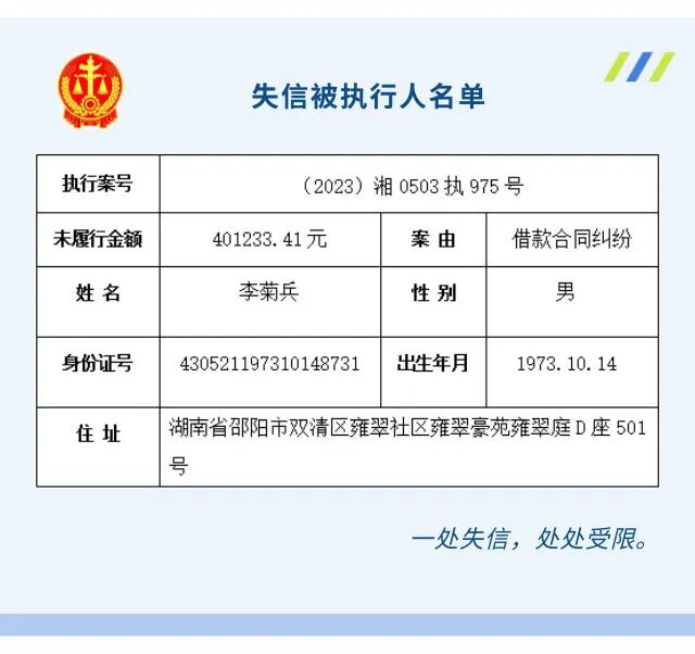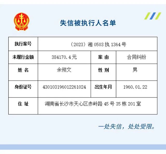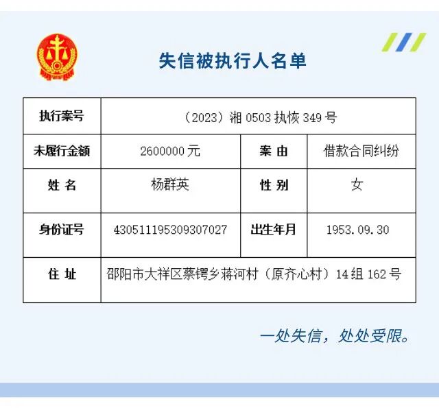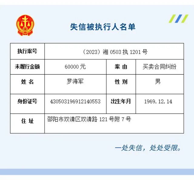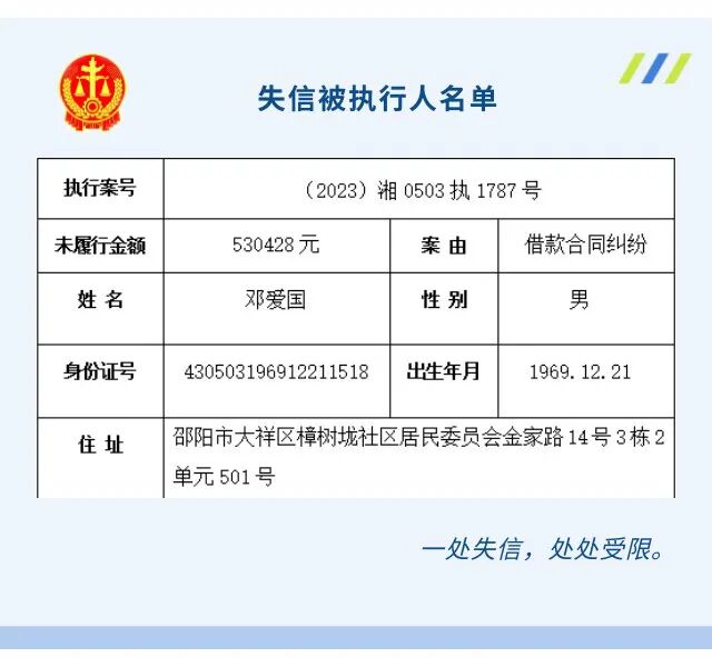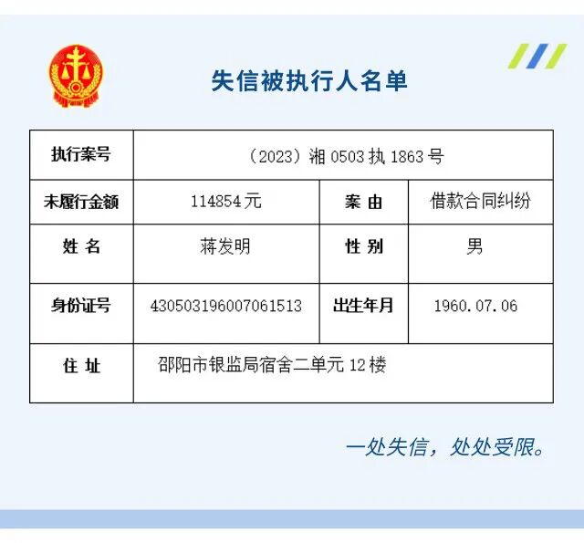 為維護法律的尊嚴與權威,督促被執(zhí)行人自覺履行生效法律文書確定的義務,邵陽市大祥區(qū)人民法院根據(jù)《中華人民共和國民事訴訟法》第二百五十五條、《最高人民法院關于公布失信被執(zhí)行人名單信息若干規(guī)定》第一條之規(guī)定,決定將下列不履行法律文書確定義務的被執(zhí)行人予以曝光,名單信息將根據(jù)結案情況及時更新,歡迎舉報失信被執(zhí)行人行蹤,提供相關財產(chǎn)線索。待核實相關信息后,請及時聯(lián)系邵陽市大祥區(qū)人民法院執(zhí)行局。