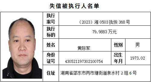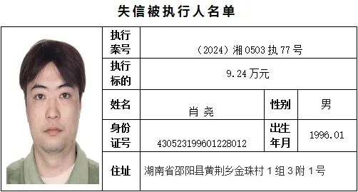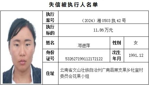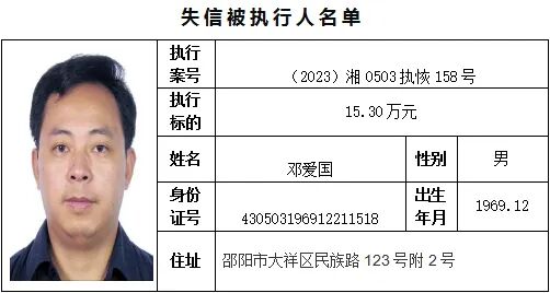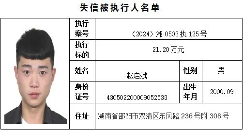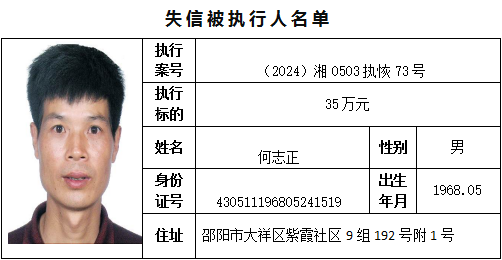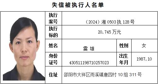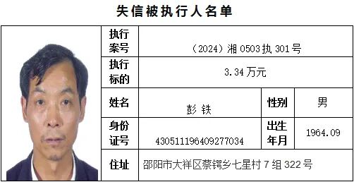 為維護法律的尊嚴與權(quán)威,督促被執(zhí)行人自覺履行生效法律文書確定的義務(wù),邵陽市大祥區(qū)人民法院根據(jù)《中華人民共和國民事訴訟法》第二百五十五條、《最高人民法院關(guān)于公布失信被執(zhí)行人名單信息若干規(guī)定》第一條之規(guī)定,決定將下列不履行法律文書確定義務(wù)的被執(zhí)行人予以曝光,名單信息將根據(jù)結(jié)案情況及時更新,歡迎舉報失信被執(zhí)行人行蹤,提供相關(guān)財產(chǎn)線索。待核實相關(guān)信息后,請及時聯(lián)系邵陽市大祥區(qū)人民法院執(zhí)行局。