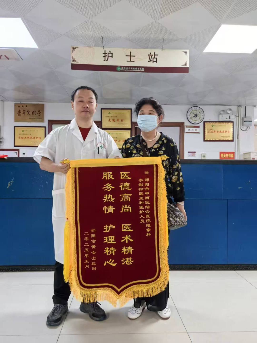 黃女士因腰部疼痛,活動(dòng)不利兩天入住邵陽(yáng)市中西醫(yī)結(jié)合醫(yī)院推拿科,住院期間主管醫(yī)師李勁松為其制定個(gè)性化治療方案,予以中藥口服散寒祛濕,推拿理筋正骨等對(duì)癥治療,并配合中醫(yī)特色護(hù)理技術(shù),經(jīng)治后黃女士腰痛及活動(dòng)不利癥狀明顯好轉(zhuǎn),為表謝意,特送錦旗一面。