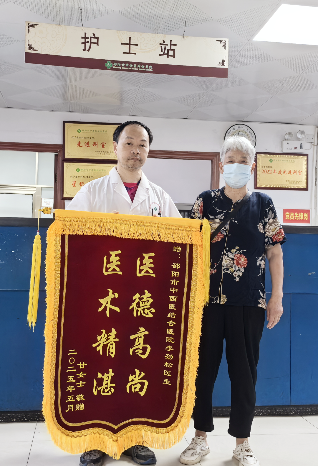 甘奶奶因腰痛、右下肢痛麻、活動(dòng)不利入住邵陽(yáng)市中西醫(yī)結(jié)合醫(yī)院推拿科,住院期間主管醫(yī)師李勁松為其制定個(gè)性化治療方案,予以中藥口服散寒祛濕,腰部穴位注射疏通經(jīng)絡(luò),推拿理筋正骨,并配以中醫(yī)護(hù)理技術(shù)隔物灸、拔罐、中藥貼敷等治療,經(jīng)治后甘奶奶腰痛、右下肢痛麻癥狀明顯好轉(zhuǎn),為表謝意,特送“醫(yī)德高尚 醫(yī)術(shù)精湛”錦旗一面。