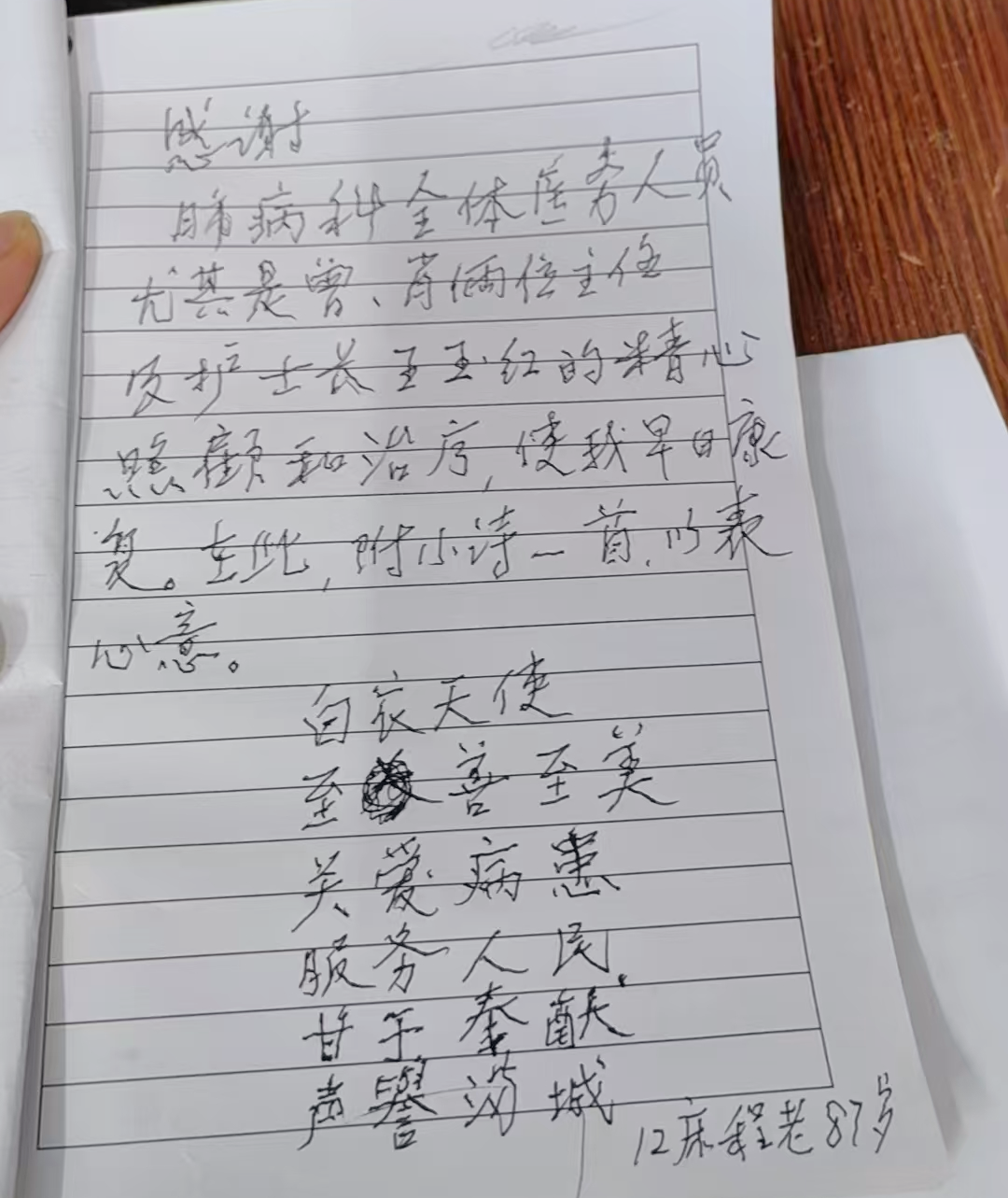 程爺爺因反復(fù)咳嗽咯痰20余年,氣促10年,加重1周入住邵陽(yáng)市中西醫(yī)結(jié)合醫(yī)院肺病科,入院后肖明珠副主任根據(jù)其病情予中成藥化痰止咳平喘,并配以中藥貼敷、耳穴療法等中醫(yī)特色治療。在全科醫(yī)務(wù)人員的精心治療與護(hù)理下,程爺爺病情好轉(zhuǎn)出院,特書寫感謝信一封感謝肺病科全體醫(yī)務(wù)人員。