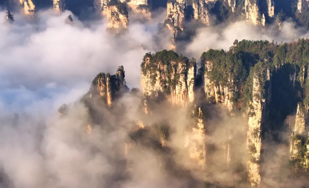 在張家界國(guó)家森林公園天子山拍攝的云海景觀(無(wú)人機(jī)照片)。新華社發(fā)(吳勇兵 攝)