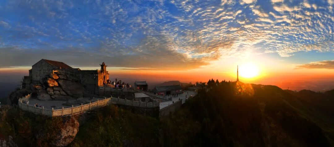 游客在湖南省衡陽(yáng)市南岳衡山風(fēng)景區(qū)欣賞日出美景(無(wú)人機(jī)全景照片)。新華社發(fā)(曹正平 攝)