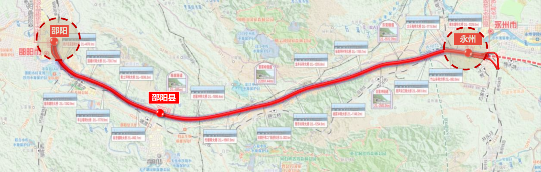 邵永高鐵北起邵陽市邵陽站,南至永州市永州站,正線全長96.1公里,設計速度為350公里/小時,總投資為197億元。全線共設車站3座,分別為邵陽、邵陽縣、永州,其中,邵陽站、永州站為既有站改擴建,邵陽縣站為新建車站。