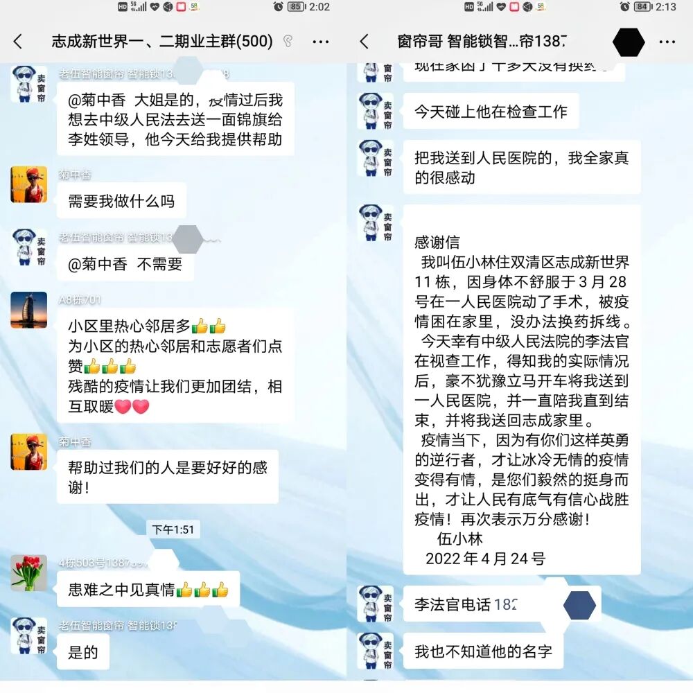 “疫情過后,我想去中院送一面錦旗給李姓領(lǐng)導,他今天給我?guī)土舜竺Γ 彪p清區(qū)志成新世界小區(qū)一名叫伍小林的居民在業(yè)主微信群表達了自己的心愿。原來,伍小林前不久因為尿毒癥剛動了手術(shù),受疫情影響,一直未能換藥,遵照醫(yī)囑,最遲今天就要做換藥拆線手術(shù),但小區(qū)離醫(yī)院還有一段距離,封控區(qū)車輛沒有通行證不能隨意上路行駛。正苦于無計可施之時,中院審委會委員、疫情防控志成社區(qū)督導員李漢斌得知這一情況后,二話不說即刻開車將伍小林送到醫(yī)院,直至他手術(shù)做完,再將其送返家中,最后竟然連姓名都未留下。