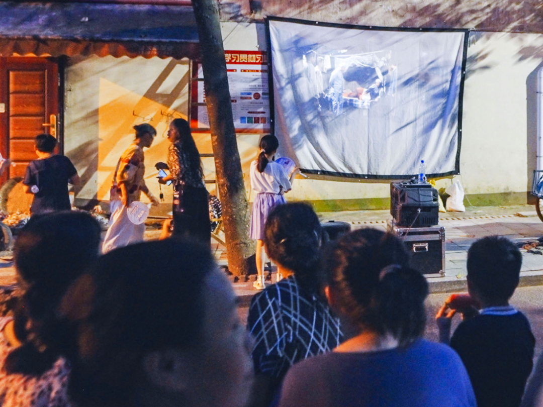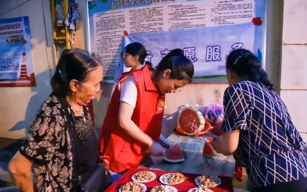 社區(qū)廣場播放著經(jīng)典老電影,老人們手執(zhí)蒲扇,沉浸在懷舊氛圍中,時(shí)而低語,時(shí)而歡笑。身著紅色馬甲的志愿者穿梭其間,為觀影居民遞上冰涼西瓜。